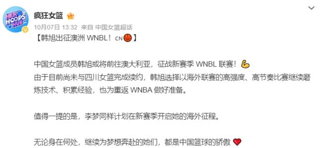 而韩旭的承诺即将兑现。目前她并没有和四川女篮续约。而且据博主我爱女篮爆料,韩旭接下来将登陆澳大利亚联赛,代表珀斯山猫队出战。据悉,韩旭这是为了明年登陆美国做准备。