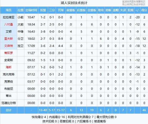 头号罪人(里弗斯):完全没打开,半场7中2仅仅得到12分1篮板6助攻,比赛一上来各种投篮不中,同时失误也非常多,糟糕的发挥是湖人快速被拉开分差的罪魁祸首!